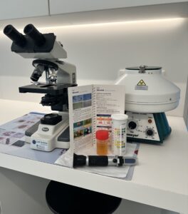 Patiënten die bloedplassen, binnen plassen, vaker of net moeite hebben met plassen, wordt ochtendurine (1ste plasje van de dag) opgevangen en onderzocht. Zo bepalen we de urineconcentratie, beoordelen we een urinestick, bekijken we microscopisch het urinesediment, … Bij nierpatiënten kunnen we het eiwitverlies via de urine ook bij ons bepalen. Liefst werken we met urine van de dag zelf, hierin zien we meer dan van urine dat al een paar dagen in de frigo staat.